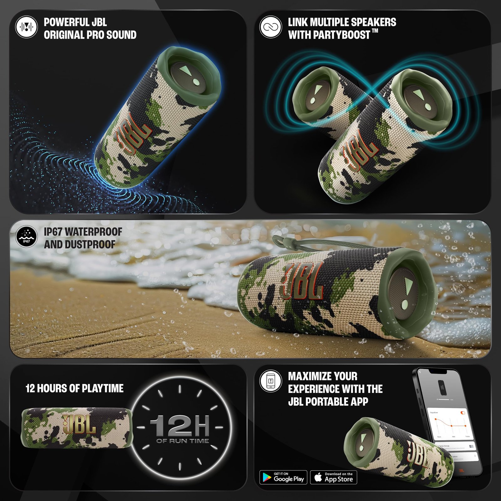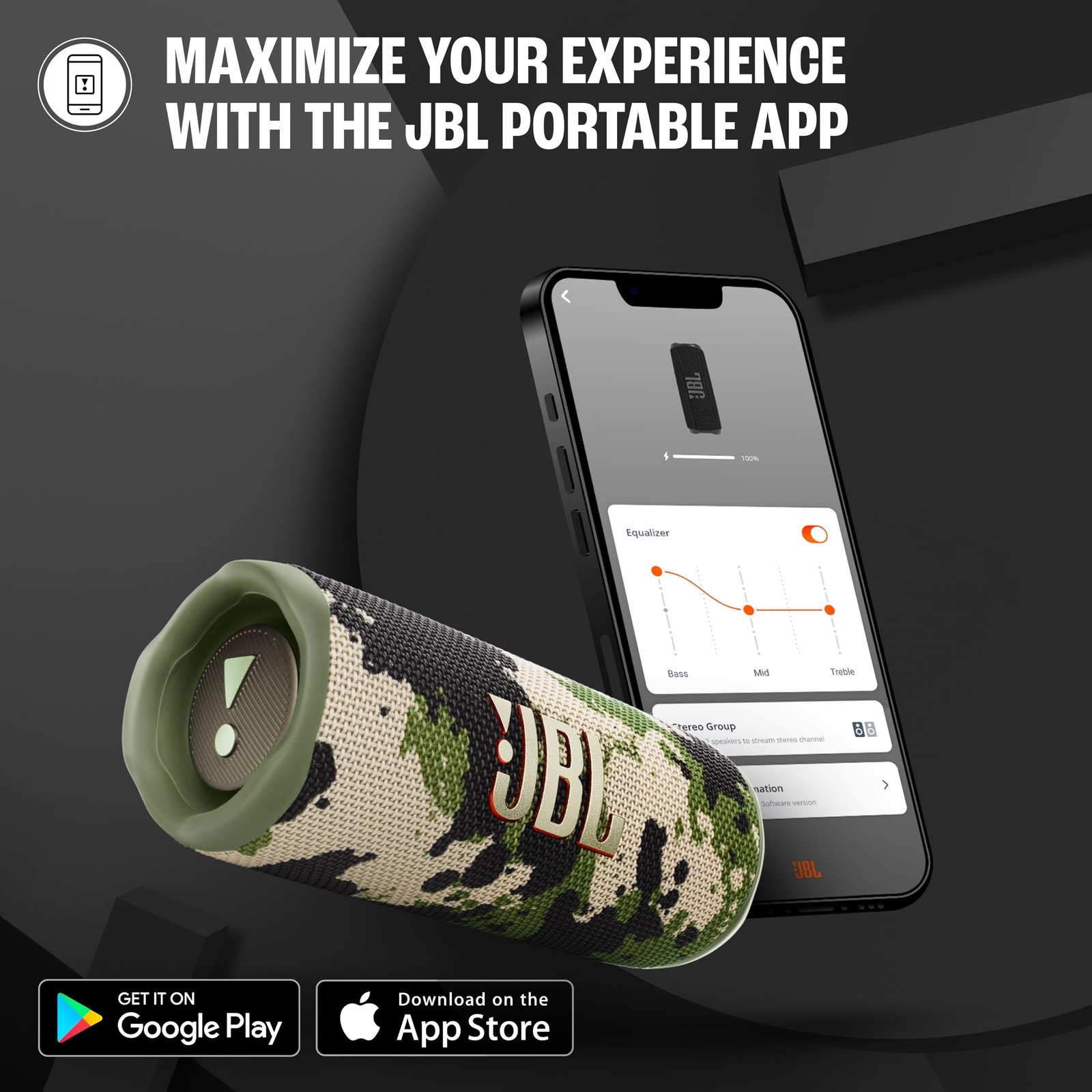 • JBL PORTABLE APP: Amplify your audio or tweak your bass using JBL portable app. Get updates & support straight from your phone.
