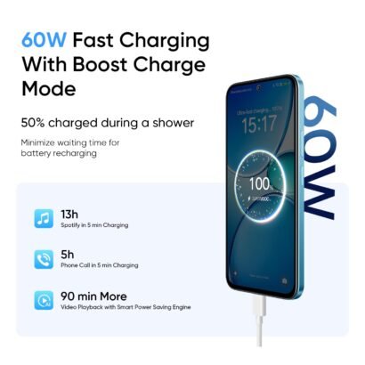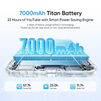 • Realme 15X smartphone is equipped with an astounding 7000mAh ultra-large Titan Battery, easily delivering over two days of enduring battery life and freeing you from power anxiety. Paired with highly efficient 60W SuperVOOC Charge, even if the battery is depleted, it can rapidly restore a significant amount of power in an extremely short time, ensuring your work and entertainment continue uninterrupted.