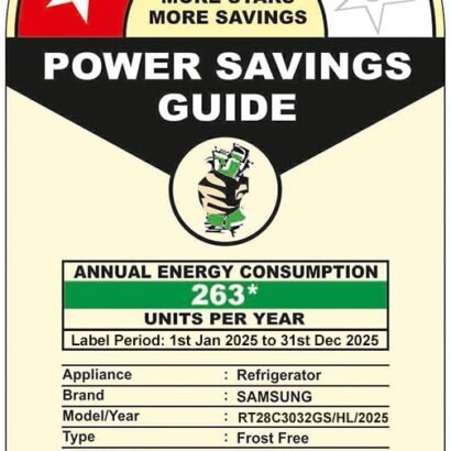 - Energy Rating : 2 Star Energy Efficiency | Annual Energy Consumption : 263 Kilowatt Hours Per Year