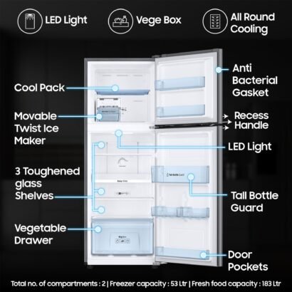 - Interior Description : Fresh Food Capacity : 183 Ltr | Freezer Capacity : 53 Ltr | Total no. of compartments : 2 | Shelves : 2 | Vegetable Drawers : 1 | Shelf Type : Toughened Glass Shelves | Anti Bacterial Gasket | Temperature Control : External