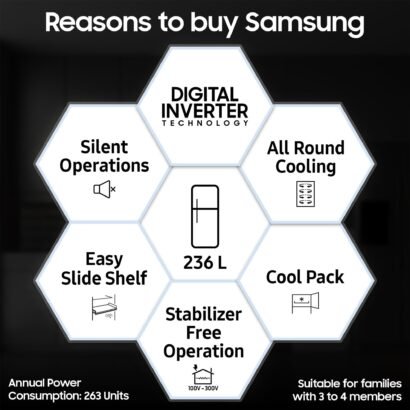 - Samsung Exclusive Features : Power Cool | Fresh room | Easy Slide Shelf | All Round Cooling